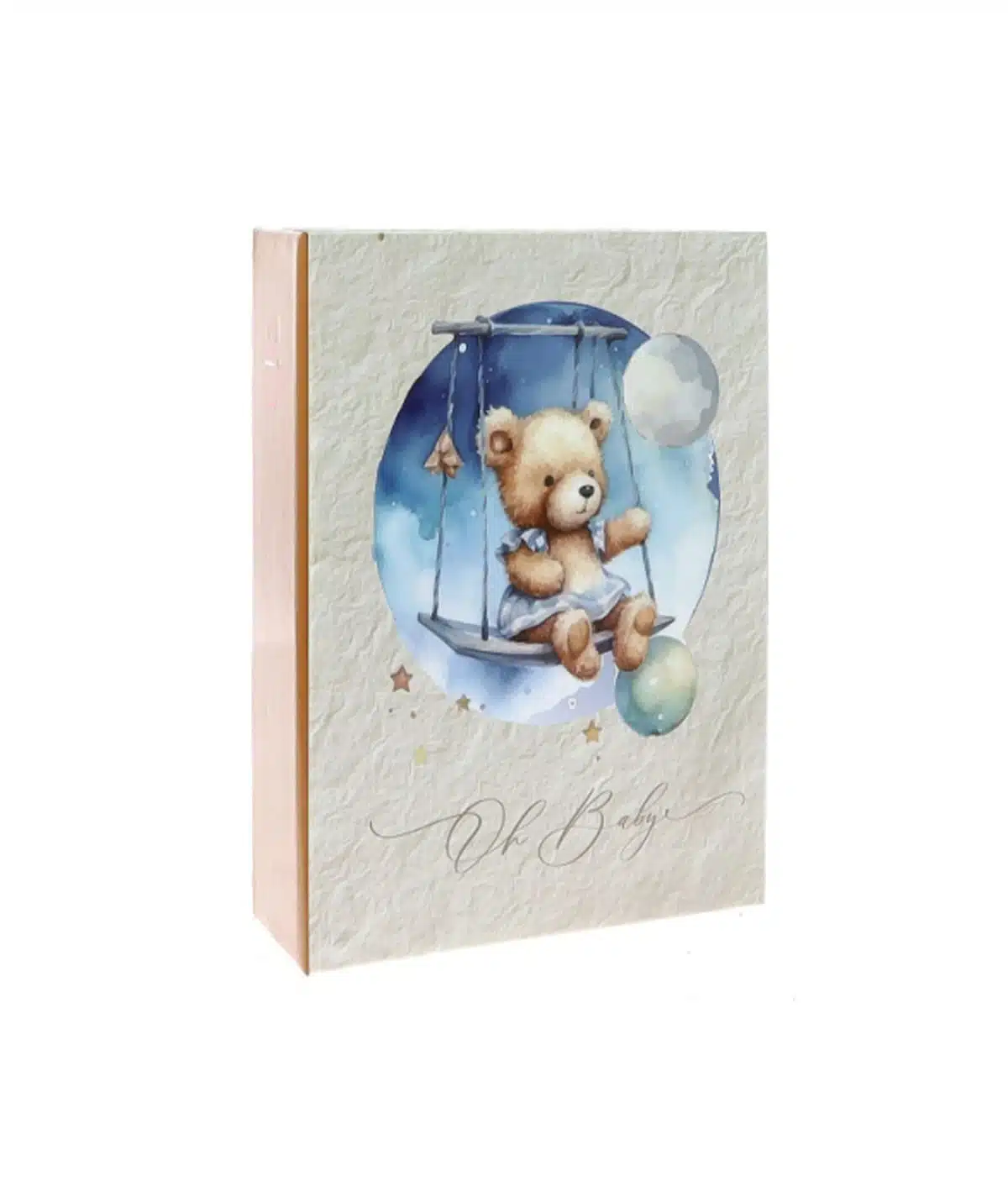 Його ніжний дизайн із милим ведмедиком у сукенці на гойдалці під зоряним небом і місяцем робить альбом особливим і казковим. Завдяки компактному розміру та зручному формату він легко збереже всі найцінніші миті життя вашої дитини.
