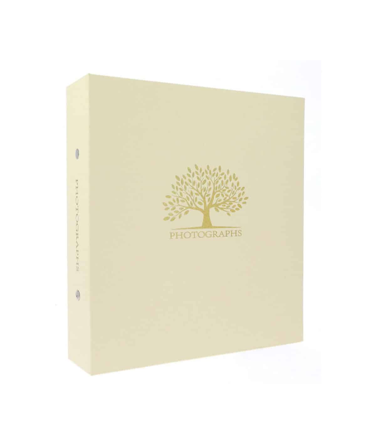 Місткий фотоальбом на 1000 фото 10×15 см у світлій бежевій обкладинці з золотим тисненням дерева та написом photographs. Усередині — чорні поліпропіленові кишеньки, 5 фото на сторінку (3 горизонтальні + 2 вертикальні). Ідеальний для великого сімейного архіву.