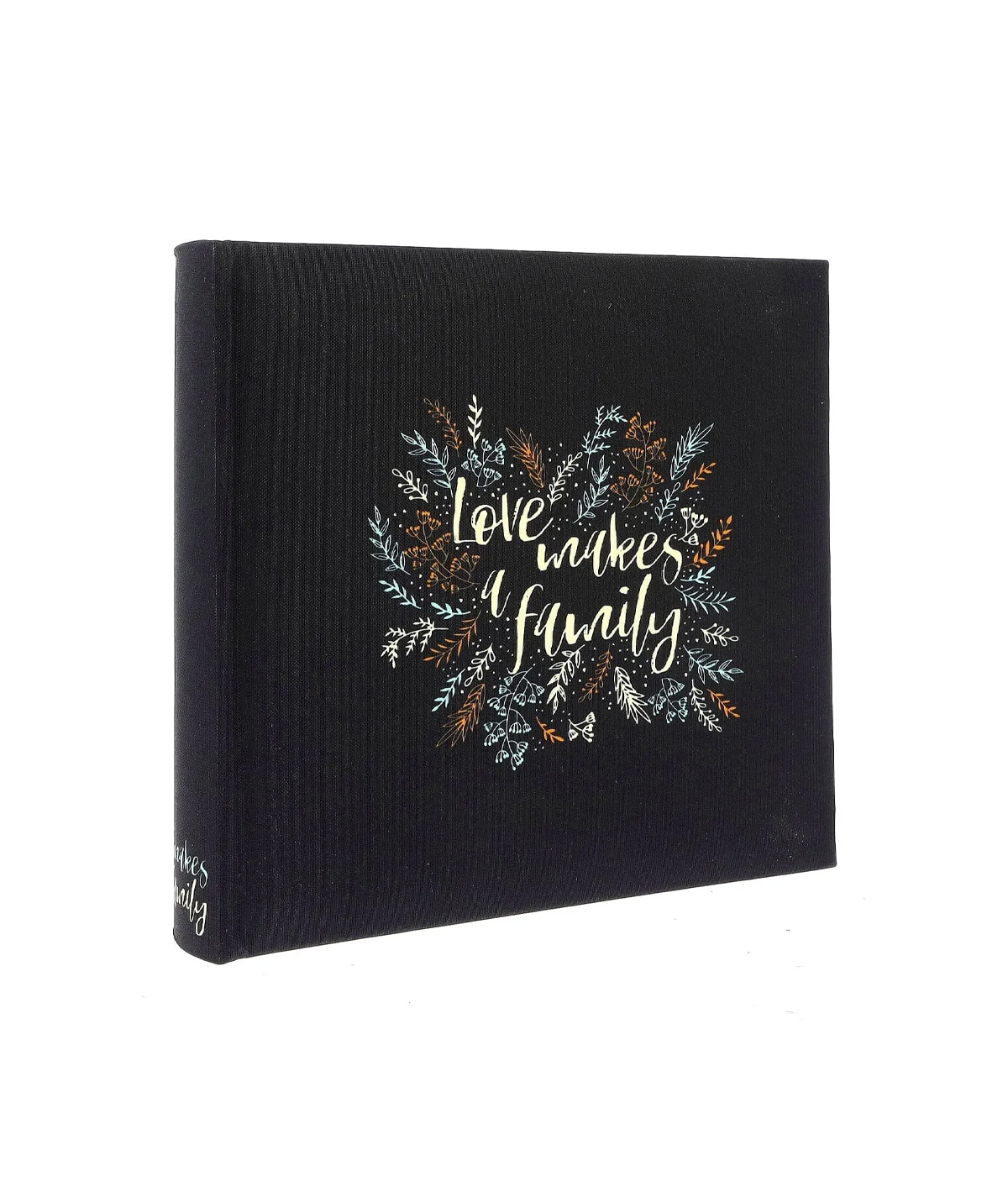 Фотоальбом Gedeon KD46200 ART136 “Love Makes a Family” на 200 фото 10×15 см із паперовими сторінками та прозорими кишеньками. Глибокий чорний фон із яскравим флористичним візерунком і написом «Love makes a family» створює стильний акцент для зберігання найцінніших сімейних спогадів.