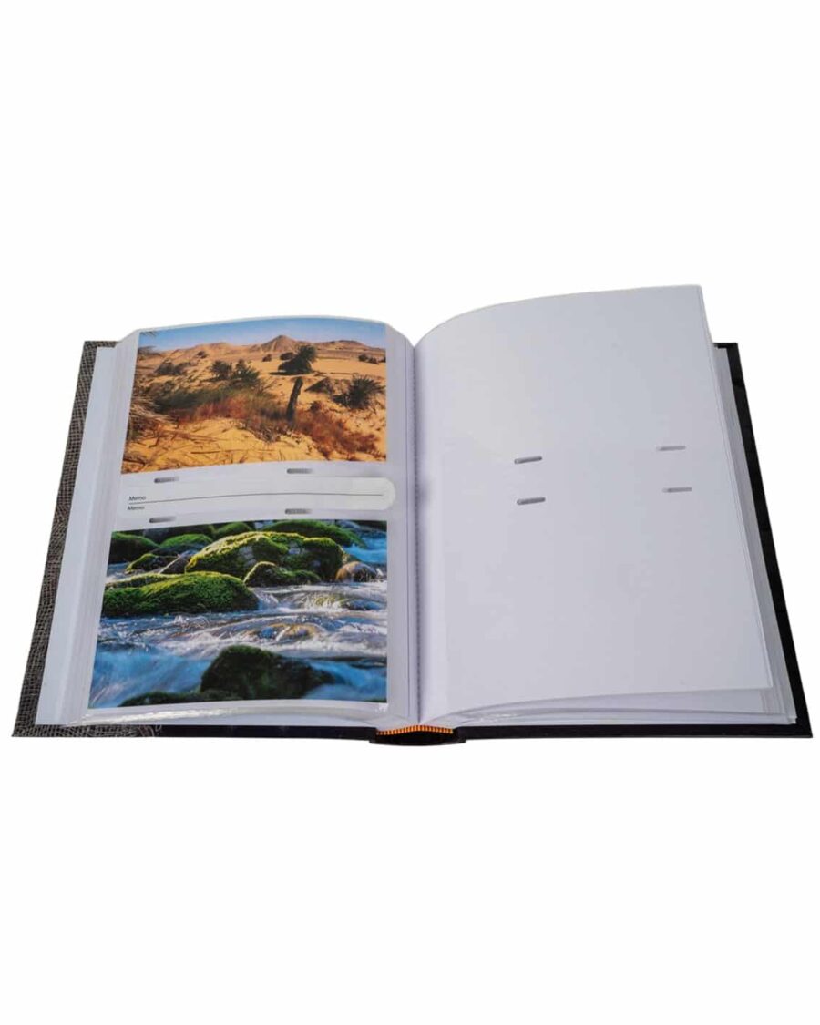 Альбом розрахований на 200 фотографій формату 10×15 см, розташованих по дві на сторінці. Сторінки виконані з білого паперу з прозорими кишеньками, які надійно захищають фото від пилу, вологи та подряпин. Біля кожної світлини є місце для підпису — можна залишати дати, коментарі або важливі нотатки.