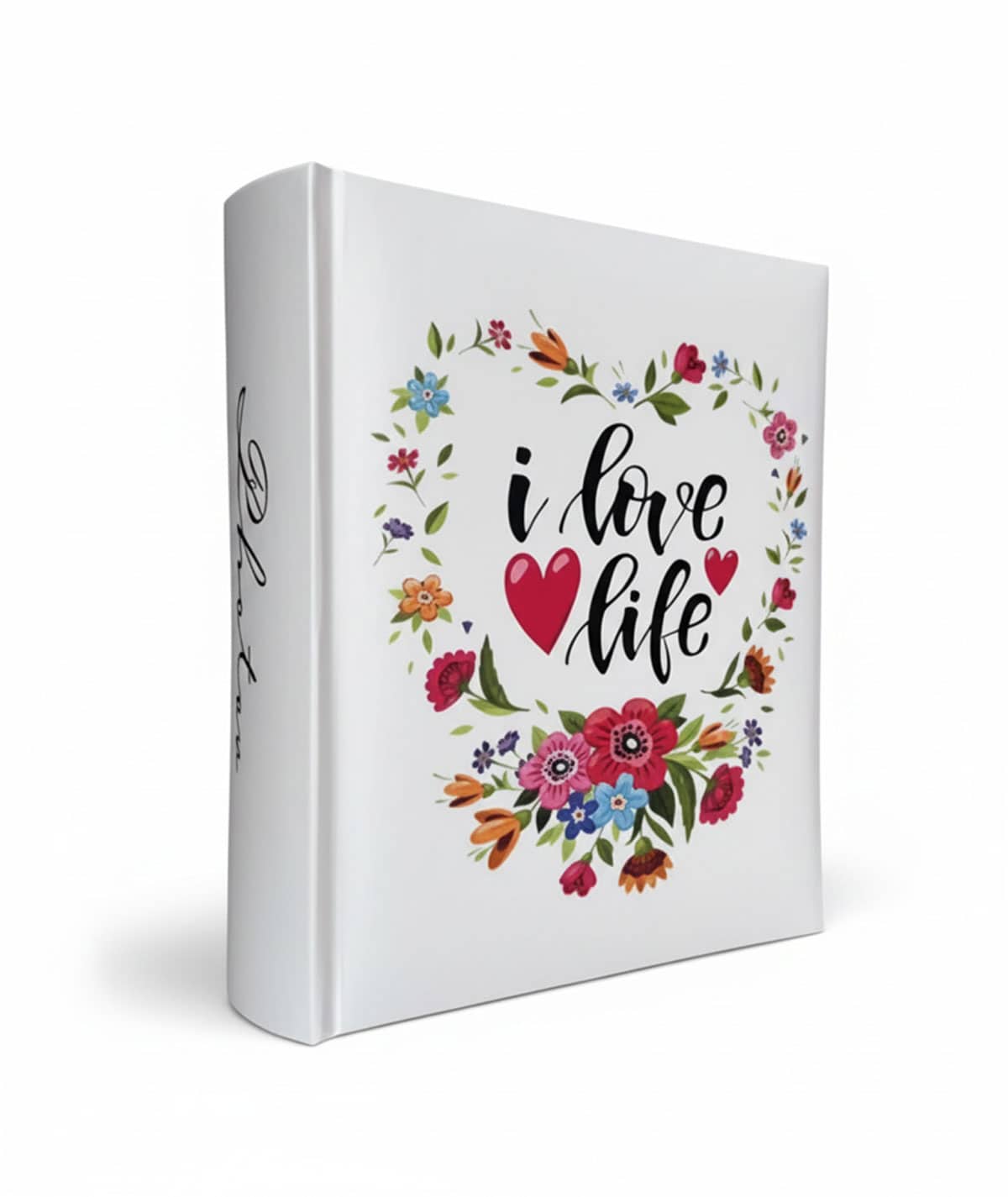 Життєствердний фотоальбом Poldom BB-10×15 серії “Dena” на 200 фотографій 10×15 см. Біла обкладинка з ламінованого картону прикрашена квітковими мотивами та написом “I love life”. Має надійну книжкову палітурку та паперові сторінки з місцем для підписів.