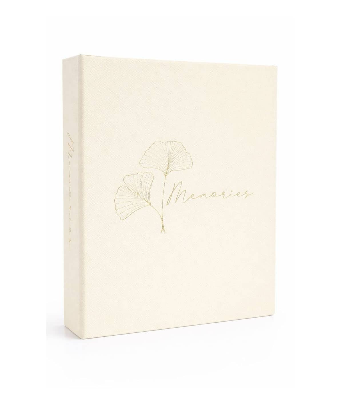 Обкладинка альбому виконана у теплому бежевому кольорі з приємною фактурою, що нагадує шкіру. Її прикрашає золотий напис “Memories” та витончене зображення листя гінкго — символу стійкості та довголіття. Такий дизайн виглядає дуже шляхетно і стане окрасою будь-якої вітальні.