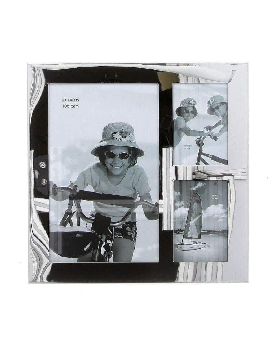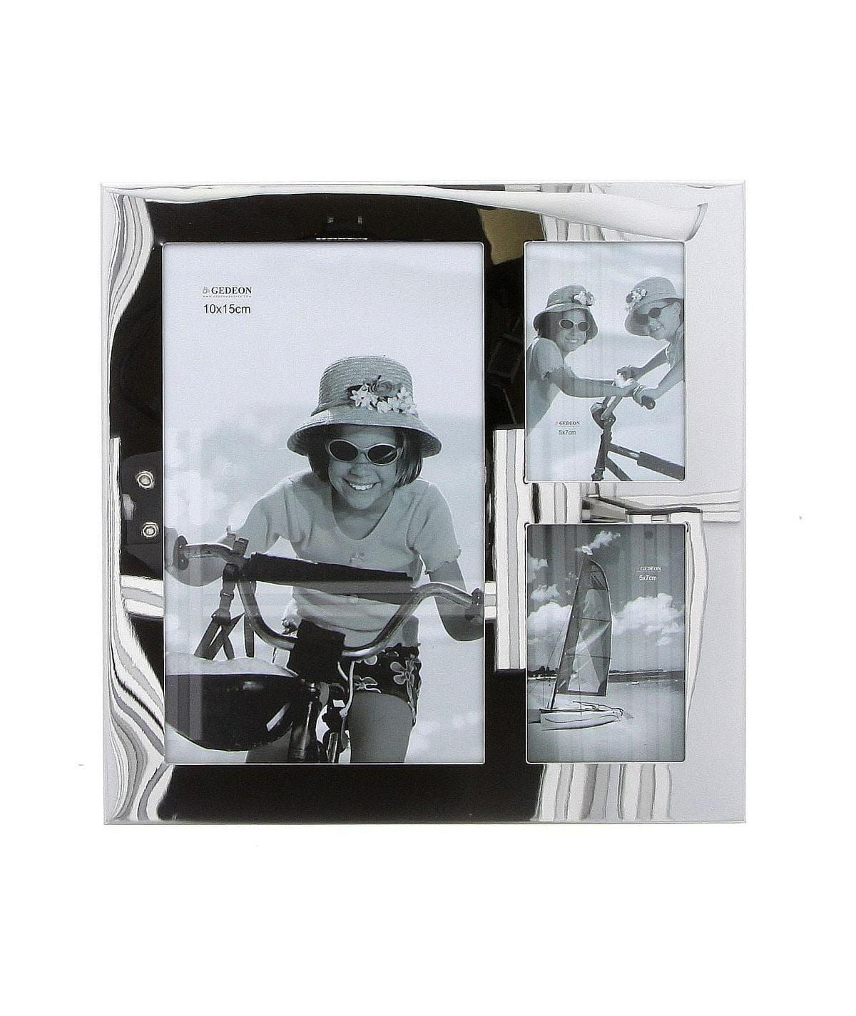 Елегантна металева мультирамка Gedeon SF063Q сріблястого кольору, розрахована на три фотографії різних форматів (10×15 см та 5×7 см). Стильне рішення для створення мініколажу на робочому столі чи полиці з преміальним оксамитовим оздобленням задника.